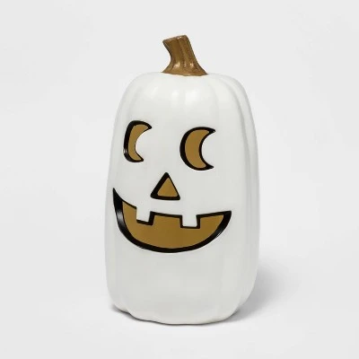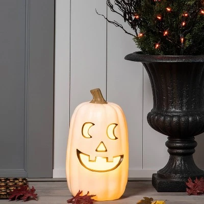 - Large light-up pumpkin with creepy face cutout and white exterior