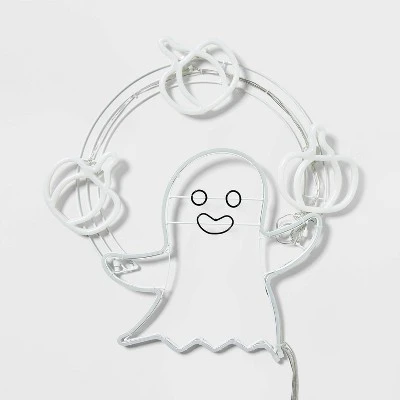 Add a bright and playful touch to your spooky Halloween decor with this 18-Inch Faux-Neon Ghost with Juggling Motion Halloween Novelty Silhouette Light from Hyde & EEK! Boutique™. Made of plastic, the electric power-sourced light is designed like a ghost juggling three pumpkins. It has 357 white, orange and green LED bulbs that emit a fun neon glow with a juggling motion effect for an amusing effect. Plus, the novelty silhouette light comes with a hanging ring and ground stake for versatile use anywhere inside or outside of your home.
