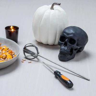Add some fun to your traditional festive ritual with the help of this 2-Count Pumpkin Carving Tools from Hyde & EEK! Boutique™. This pumpkin carving tool set includes one carver and one hollow-out tool, both made from metal to let you easily remove pumpkin seeds and pulp and carve out a classic, grinning jack-o’-lantern and other spooky designs. Use these tools in conjunction with a tracer, poker, detailer, etcher and scoop to create fun pumpkin carvings.
