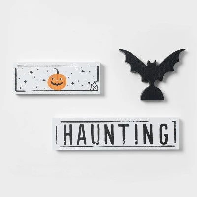 Finish off your Halloween decor with the 3-Piece Happy Haunting Block Sign from Hyde & EEK! Boutique™. This block sign includes one piece with the message “Happy” and other with the message “Halloween” on one side “Haunting” on the other. It also includes a wooden bat to complete the decorative look. Suggested for indoor use, this wood block sign adds decorative appeal to your seasonal decor.
