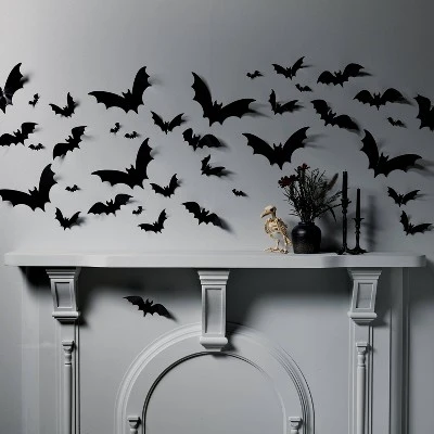 Bring an eerie bat-titude to your decor with these 40-Count Bat Halloween Party Decorations from Hyde & EEK! Boutique™. The black flying bats in this Halloween decor kit are made of plastic and come in sets of ten each of extra-large, giant, medium, and small bats. Also included are three sheets of adhesive dots and an instruction sheet to help you get started right away. Decorate the wall above the mantel or any sheltered outdoor space to create the ideal backdrop for a festive and spooky scene.