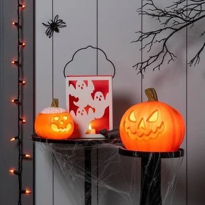 Add a timeless, slightly spooky touch to your festive Halloween decorations with this 9-Inch Lit Pumpkin Halloween Decor from Hyde & EEK! Boutique™. Made from plastic in a classic orange hue, this light-up pumpkin prop features a scary, jagged grin with triangle eyes and an arrow-shaped nose. The battery-powered light is controlled with an easy on/off switch, and it’s designed for both indoor and outdoor use.