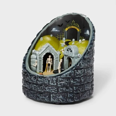 Give your home a spooky refresh with this Animated Graveyard Scene Halloween Decor from Hyde & EEK! Boutique™. This Halloween Decor features skeletons and tombstones placed inside a tree trunk for a festive and creepy look, and it lights up with the help of the included three AAA batteries. Designed for indoor use, you can place this decorative prop on a mantel or shelf alone or with other Halloween props for an eerie display.