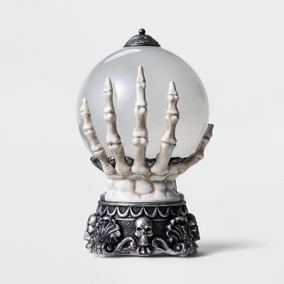 Add a spooky centerpiece to your mantel or table with the Skeleton Hand Foggy Crystal Ball Halloween Decor from Hyde & EEK! Boutique™. A pair of skeletal hands holds a crystal ball that lights up and glows with swirling colors with the help of the included 3 AA batteries. Designed for indoor use, this crystal ball scene prop works as either a solo accent piece or as part of a larger Halloween display.