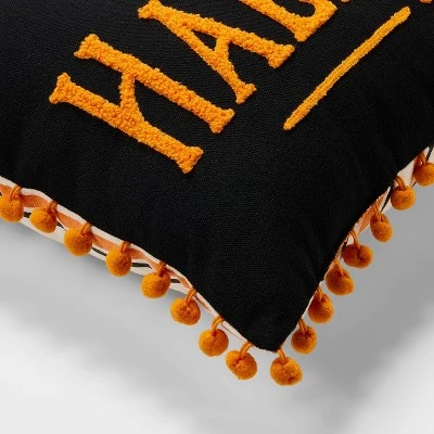 Bring welcoming touch to your living room with this ‘Happy Halloween’ Lumbar Pillow from Hyde & EEK! Boutique™. Made from a soft fabric with soft filling, this rectangular lumbar pillow offers cushioned support. It features a reversible design with the front displaying an embroidered message that reads “Happy Halloween” in orange on a black background while the reverse features black and orange stripes on a cream background. Orange pompoms on each side finish off the festive look.