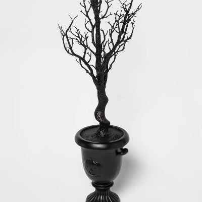 Design a stunningly spooky corner of a room or welcome guests to your haunted home with the Porch Pot Halloween Artificial Plant from Hyde and EEK! Boutique™. This Halloween-inspired decorative porch pot features twisted dead-looking branches with glitter for a delightfully creepy finish. The all-black artificial tree comes in a black pedestal vase designed to look like stone, complete with a pumpkin face and handles.