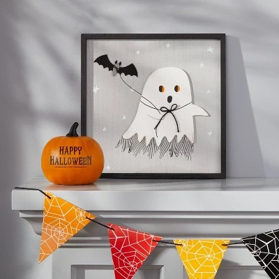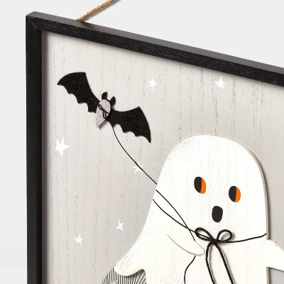 Make your Halloween decor look more haunting with the Ghost with Bat Halloween Wall Sign from Hyde & EEK! Boutique™. This framed wall sign features a bat and a ghost for a spooky-fun look. Made with wood, this wall sign is recommended for indoor use only.