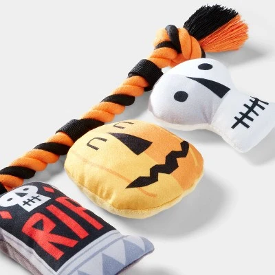 This Halloween Plush Icons Dog Toy from Hyde & EEK! Boutique™ lets your furry friend get in on the seasonal fun. This rope dog toy features Halloween-themed icons including a pumpkin, tombstone and skull for festive, spooky appeal. Designed to crinkle and squeak, it’s sure to excite your dog and is great for playing tug-of-war.