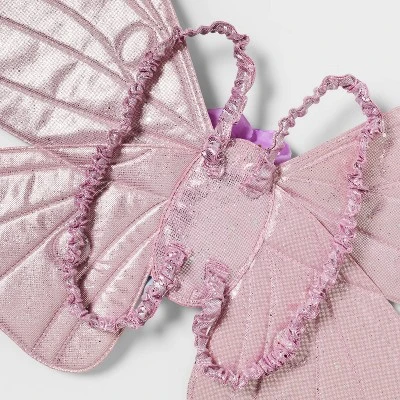 - Includes floral crown with rainbow tassel and sparkly pink butterfly wings with floral accents