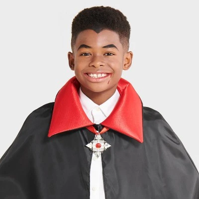 Your kid will love putting on this Kids’ Vampire Halloween Costume Cape with Necklace from Hyde & EEK! Boutique™. Made from a lightweight fabric, this costume helps them stay comfortable all through trick-or-treating or pretend play. This costume features a black cape designed with a large, puffy collar in red and an ancient-looking necklace to complete the look. To finish off their Dracula dress-up, they can add plastic fangs to their look.