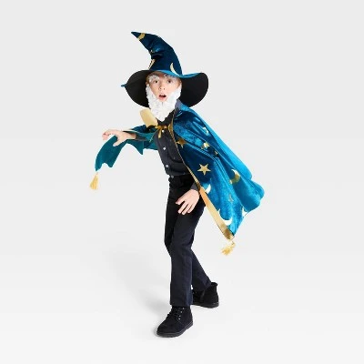 Whether they’re channeling Merlin the Magician or their inner Gandalf from Lord of the Rings, this Kids Wizard Halloween Costume Accessory Set from Hyde & EEK! Boutique™ will magically transform them in time for their class party! This two-piece costume accessory set features a mid-length, lightweight wizard cape in blue decorated with gold stars, moons, and two gold tassels on the hem at the opening, and gold ribbon ties that extend from the neck of the wide golden collar to keep it secure. The matching, oversize wizard hat completes the look. Perfect for wearing over their street clothes while trick-or-treating, this one-size set can also be paired with anything from a tuxedo to their favorite jeans and Harry Potter T-shirt.