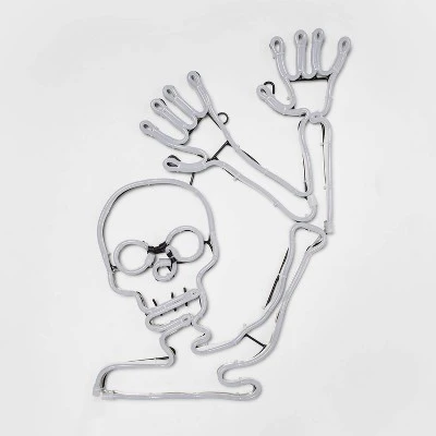 Create a scary Halloween scene by lighting up with this LED Lighted Faux Neon Waving Skeleton Halloween Novelty Silhouette Lights from Hyde & EEK! Boutique™. Designed in the shape of a skeleton waving, this skeleton novelty light illuminates with multiple LED bulbs to help you add a spooky touch to your seasonal decor. Hang this LED Halloween decoration indoors or outdoors with skeleton and ghost decorative props to frighten up the guests or trick-or-treaters.