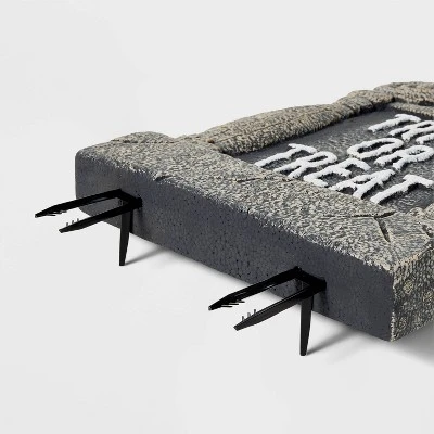 Greet trick-or-treaters as they approach your house with this Light-Up Pumpkin Trick or Treat Foam Halloween Decorative Tombstone from Hyde & EEK! Boutique™. This foam gravestone features a carved weathered base with a pumpkin on top and the text “Trick Or Treat” embossed on the front. The battery-operated decoration has a light-up design to create a spooky glowing effect, and it’s suitable for both indoor and outdoor use. Place it on your front porch or next to your garden graveyard scene to complete your Halloween display.