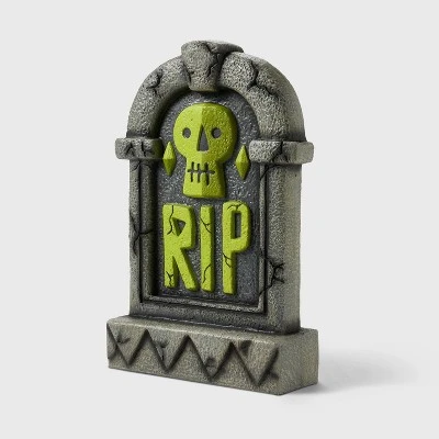 Complete your spooky scenery with this Light-Up RIP Skeleton Blow Mold Halloween Decorative Tombstone from Hyde & EEK! Boutique™. This decorative blow mold tombstone features a weathered base with a neon green skeleton face along with “RIP” embossed on the front. The battery-operated decoration has a light-up design to create a spooky glowing effect, and since it’s suitable for both indoor and outdoor use, you can place it on an entryway table, on your front porch or on your lawn.