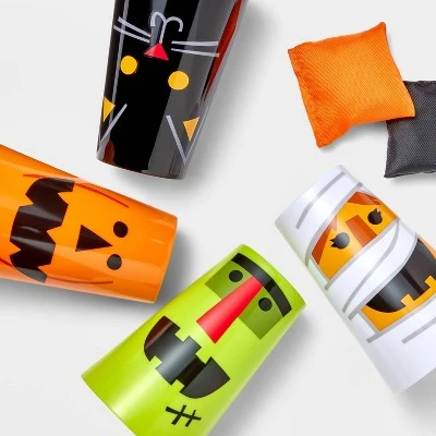 - Halloween-themed cup and bean bag toss game