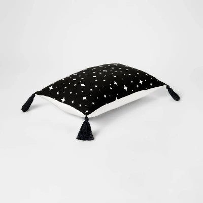 Set up the right tone for the festivities with this Reversible ‘Greetings Ghouls’ Halloween Decorative Covered Porch Pillow from Hyde & EEK! Boutique™. Wrapped in 100% cotton fabric with soft filling, this rectangular lumbar pillow offers cushioned support. It features a reversible design with the front displaying the embroidered message “Greetings Ghouls” in black on a white background, while the reverse features white stars on a black background. Plus, it’s accented by black tassels on each corner to accentuate your Halloween decor.