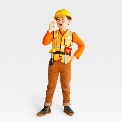 This Toddler Construction Worker Halloween Costume Accessory Set from Hyde & EEK! Boutique™ will help their imagination soar long after Halloween! This four-piece costume accessory set features a yellow safety vest with black and silver trim and a hook-and-loop closure at the front, as well as a pocket and belt loops for hanging the included toy hammer and saw. The matching yellow hard hat completes the look. Perfect for wearing over their street clothes while trick-or-treating, this one-size set can also be added to their dress-up outfits for hours of pretend fun.
