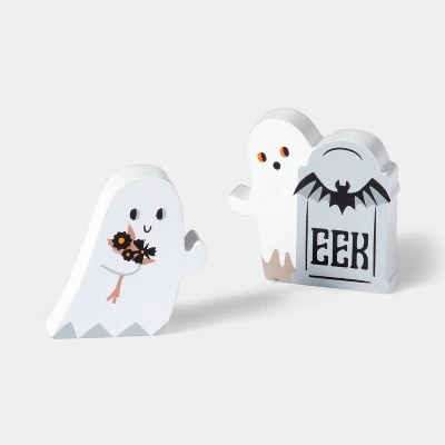 Accessorize your mantle with this Wood Mini Mantle Ghosts and Tree Halloween Decor from Hyde & EEK! Boutique™. This set of assorted Halloween props includes different designs of white ghosts, a black tree with bats on it and a tombstone accent for a cute and creepy look. These mini-sized props are ideal for placement on a mantle, shelf or console table. You can display them together or along with other Halloween-themed props to complete your festive setting.