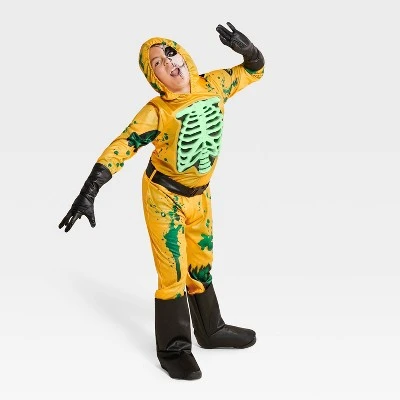 Your kid will be dressed up for the Halloween in creepy-cool style with this Glow in the Dark Biohazard Halloween Costume Jumpsuit from Hyde & EEK! Boutique™. Made from a lightweight fabric for all-day comfort, this Halloween costume set includes a yellow jumpsuit with exposed glow-in-the-dark skeleton ribs, plus a black belt and a pair of gloves. They can wear it with black shoes to complete the look.