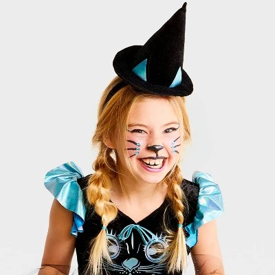 They’ll be ready to pounce on the candy with cute cat-titude in this Pompom Cat Witch Halloween Costume Dress with Accessories from Hyde & EEK! Boutique™. This Halloween witch dress is designed with a black bodice featuring a cat face, blue cap sleeves, a front blue ribbon, and a blue tie with a cat tail at the back. Plus, it features an attached black tulle skirt with allover silver dots and colorful pompoms along the hem as well as a black witch hat and black gloves. They can coordinate the dress and accessories with a broomstick and a handheld black cauldron to complete the look.