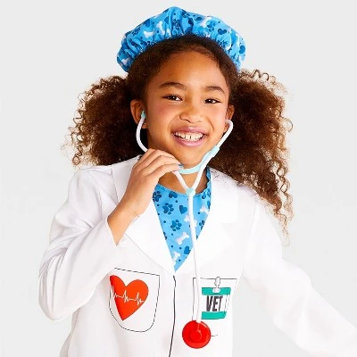 Your animal-loving kid can dress like their future occupation for Halloween with this Veterinarian Halloween Costume Top with Accessories from Hyde & EEK! Boutique™. Made from lightweight fabric for cozy wear while trick-or-treating, this costume features a white coat with various vet-themed prints, including a paw print and a guinea pig, plus a stethoscope and a blue hat. They can wear it with any of their favorite pants and sneakers to complete the look.