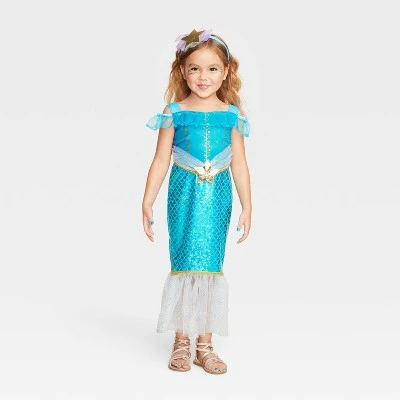 Introduce everyone to a cute mermaid at your next Halloween party by dressing up your toddler in the Ethereal Mermaid Halloween Costume Dress with Headpiece from Hyde & EEK! Boutique™. This blue mermaid costume dress features a mesh belt with a gold star buckle plus shimmery lace detailing for a beautiful look. Made from soft and lightweight fabric, the dress comes complete with a matching headpiece featuring a gold-tone star to complete the look.